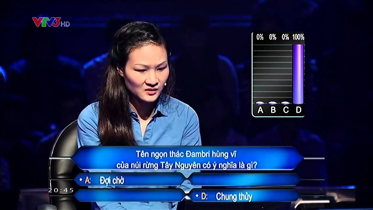 | Câu số 8/15 (10.000.000 đồng) - Không giới hạn thời gian Sử dụng các quyền "Gọi điện thoại cho người thân", "50:50" và "Hỏi ý kiến khán giả trong trường quay" Còn 1 quyền trợ giúp (Tư vấn tại chỗ) | |